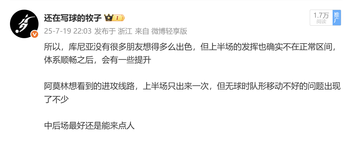 “可以说,这场比赛的整体表现,其实说明了库尼亚等人的短板,也说明了曼联在新赛季缺不了中锋角色的加入。