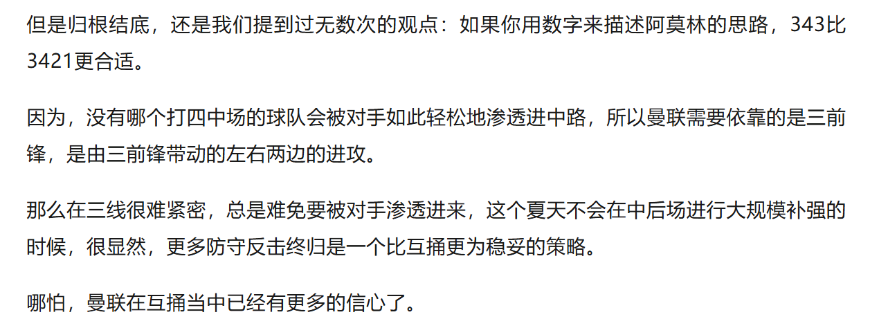 在这种情况下,曼联才有可能摸到自己的成绩上限,这也就是我们在上一场比赛后所说的:‘曼联下赛季的进攻端是什么样子,这个问题现在需要打一个问号,而你在这里打了问号,那么就需要给曼联的整个赛季都要打上一个问号。’